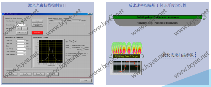 提供激光光束扫描功能,在靶材上保持固定的光通量(J/cm2 )。光束扫描可以使薄膜在衬底上均匀地沉积,厚度均匀性为 5% 或更好。当激光光束进行扫描时,反射镜和透镜同步运动,以确保激光光束在靶材上有固定的光通量。激光扫描使用反比 速率协议,以确保在沉积薄膜时,靶材表面消融均匀。