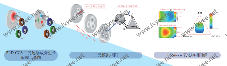 PLD CCS(连续成分生长)功能可在单次沉积中沉积多种不同组分的材料,大大缩短了沉积不同组分材料及合成新材料的时间, 实现合成材料组分的优化。PLD-CCS 系统能以连续的方式改变沉积的材料,没有必要使用掩模。可以在每一次循环中, 以小于一个单分子层的速率,快速连续沉积每一种组分,其结果类似于共沉积法。该法无需在沉积后进行退火促进内部扩 散或结晶,对于生长温度是关键参数的研究或者被沉积的材料或衬底不适合高温退火的情况非常有帮助。Neocera 公司的 PLD 系统在同一个系统上既可以实现带有 CCS(连续成分生长)功能的 PLD(CCS-PLD), 也可以实现基本的 PLD 功能。